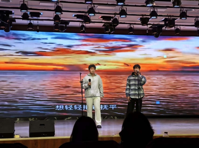本次赛事以“时光筑声,和声聚梦”为主题,来自全校18个学院的初选优秀队伍同台竞技,各队伍以齐唱加和声的形式展现声乐魅力。我院参赛选手张宝晨、彭宏炜登台演唱歌曲《形容》。为在舞台上完美呈现,他们反复磨合、协同打磨,从发声技巧到情感处理精雕细琢,不断调整和声与主旋律的契合度。