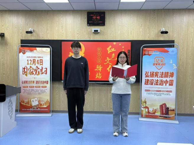 遵宪法精神,铸法治信仰。12月2日,我院开展第四十七期思政年历微思政课交互体验活动——国家宪法日,习近平新时代中国特色社会主义思想青年学习会骨干成员陈清华、张颢鹏担任主讲人,并特别邀请法学院法学专业2025级学生杨谨榕共同参与。