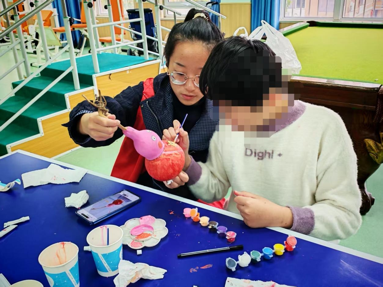 活动过程中,志愿者与孩子们亲切交流,传递关怀与理解。在他们的共同努力下,素色葫芦被赋予生动色彩与童趣创意,不仅诞生出一件件充满想象力的彩绘作品,也编织了一段充满欢声笑语的美好回忆。活动最后,孩子们手捧绘制的创意葫芦作品,与志愿者合影留念。