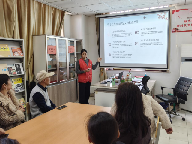 活动现场,团支部成员围绕近年来涌现的见义勇为先进事迹和典型案例,从时代价值、法律依据、理念转变、社会影响四个维度展开系统讲解。宣讲内容既有对正义精神内涵的深入解读,也融合了贴近现实的行为指引,以通俗易懂的语言帮助社区居民全面理解见义勇为的重要意义,切实增强对见义勇为行为的认知与认同。