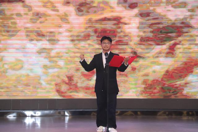 比赛现场,刘洋以朗诵《黄河颂》震撼全场。随着伴奏音乐缓缓响起,他用浑厚而富有感染力的嗓音开篇,瞬间将观众带入黄河奔腾咆哮的壮阔意境之中。朗诵过程中,他情感饱满真挚,语调抑扬顿挫,凭借对作品情感脉络的精准把握,将对黄河的赞美、对祖国的热爱以及对民族精神的敬仰展现得淋漓尽致,生动传递出黄河的雄浑气魄与民族精神的坚韧不拔,深深感染了现场观众,赢得阵阵掌声。